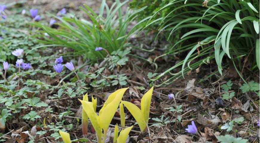 Воспользуйтесь тем фактом, что хосты появляются поздно, и засаживайте большие открытые пространства луковицами весеннего цветения и первоцветами. По мере того, как раноцветущие растения отмирают, вновь появляющиеся листья хосты скроют их из виду. Подснежники, миниатюрные нарциссы, прострелы, тюльпаны, хохлатки — хорошие спутники хосты.