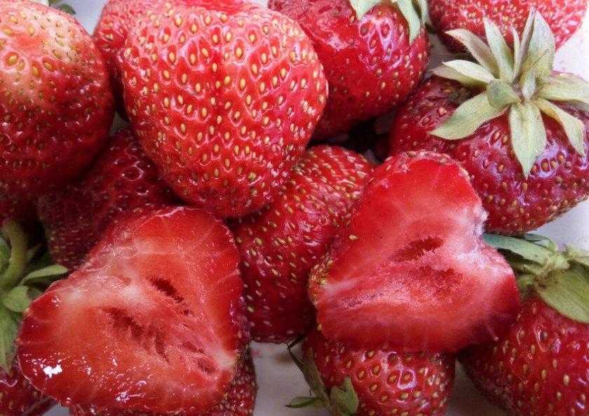Мякоть светло-розового оттенка, плотной структуры. Мякоть источает приятный земляничный аромат.
