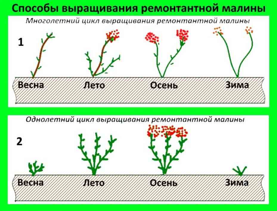 Обыкновенные сорта малины уходят на зимовку со спящими почками, после весеннего пробуждения на побегах появляются цветочные веточки с бутонами. Если верхняя почка подмерзает, цветы появляются из листовых почек, которые спешно превращаются в плодовые. Отдавший урожай стебель малины погибает.