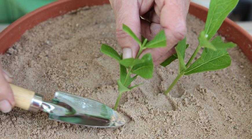 Подращивать черенки можно сразу в школке (разводочной грядке с защитой от прямых солнечных лучей и возможностью контролировать уровень влажности) или сначала укоренить в кашпо, а потом высадить в школку. Сажать черенки удобно с помощью пикировочного колышка. Черенок погружают в почву до верхнего узла. Грунт должен быть рыхлым, воздухопроницаемым. Верхний слой желательно присыпать мелким речным песком — он предохранит почву от иссушения и не даст образоваться корке.