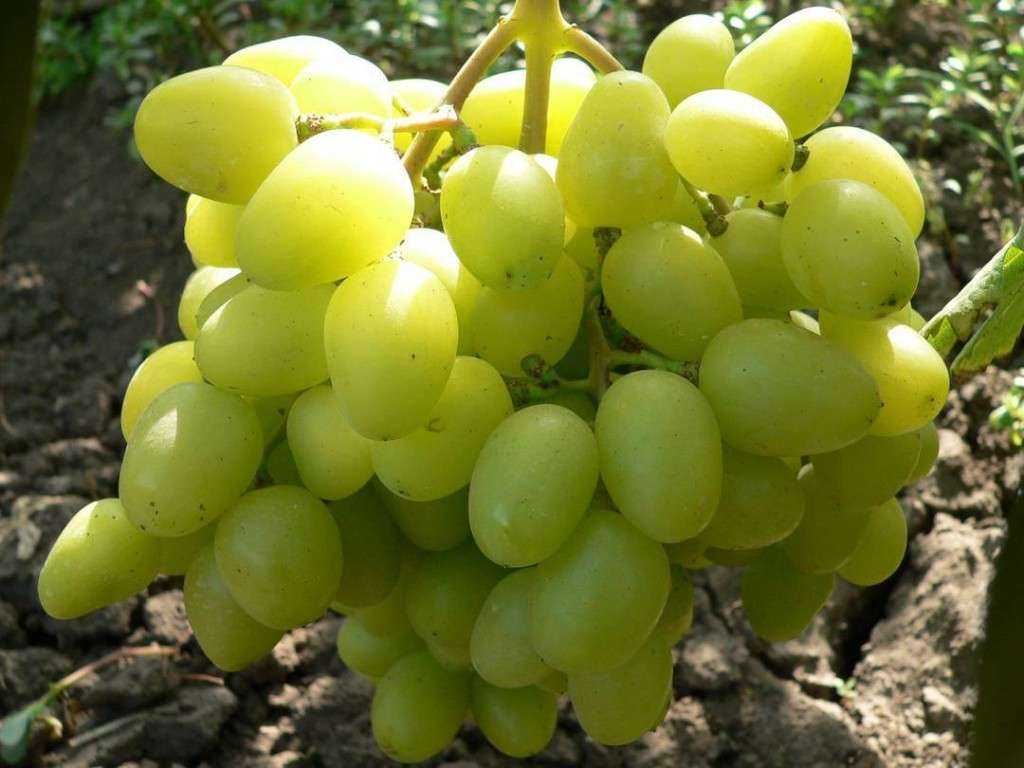 Внешне он напоминает сорт Аркадия, только ягоды вырастают в два раза крупнее. Цвет ягодок имеет приятный желтоватый оттенок, иногда может быть ярко-салатового тона. Лоза сильно разрастается, на одном кусте созревает большое количество гроздей.