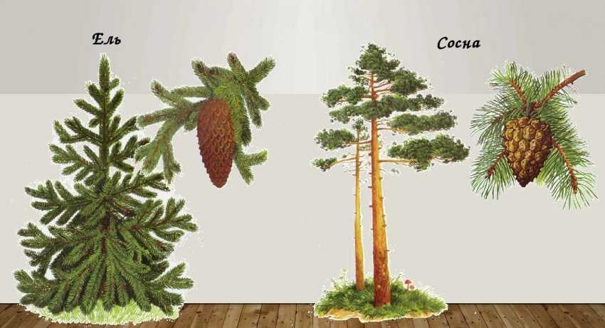 У ели хвоя острая, густая, очень мелкая, всего до 2-х см. Состоит это дерево из одиночных игл, семя и веток. У сосны — длинная редкая хвоя, до 4-х см, по две иглы в пучке.