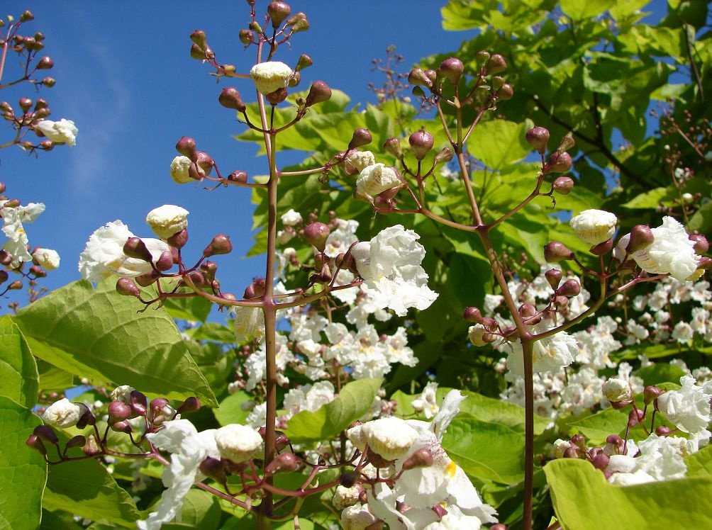 - Катальпа бигнониевидная (catalpa bignonioides) — вырастает до 20 м. Листья на ветках располагаются супротивно, очень рано опадают. Цветение происходит в июне — на ветках появляются прямостоячие соцветия с цветами, имеющие форму воронки. Цветки слабодушистые, в длину около 5 см. Внутри цветка бывают красные пятна, края лепестков слегка гофрированы. По-другому бигнониевидную катальпу называют сиренелистной.