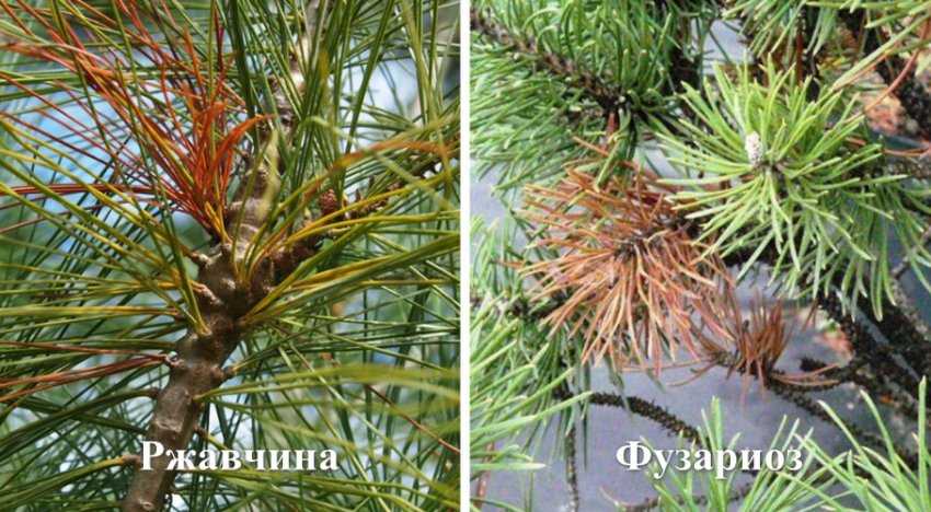 Еще одним распространённым заболеванием сосны является ржавчина, которая вызывает неестественное изгибание ветвей и гибель верхушек побегов хвойных. Методы борьбы со ржавчиной — удаление поражённых веток и внесение в почву иммуностимуляторов.