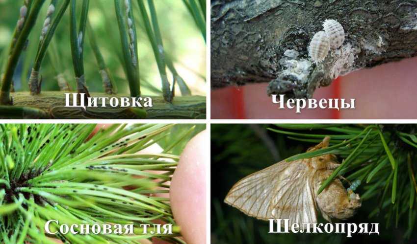 Хвойные подвергаются атакам и мелких вредителей, таких как щитовка, червецы, сосновая тля, шелкопряд, огнёвка, сосновый лубоед, сосновый усач. Паразиты питаются хвоей или корой растений, иногда поражая растение до такой степени, что его уже невозможно спасти.