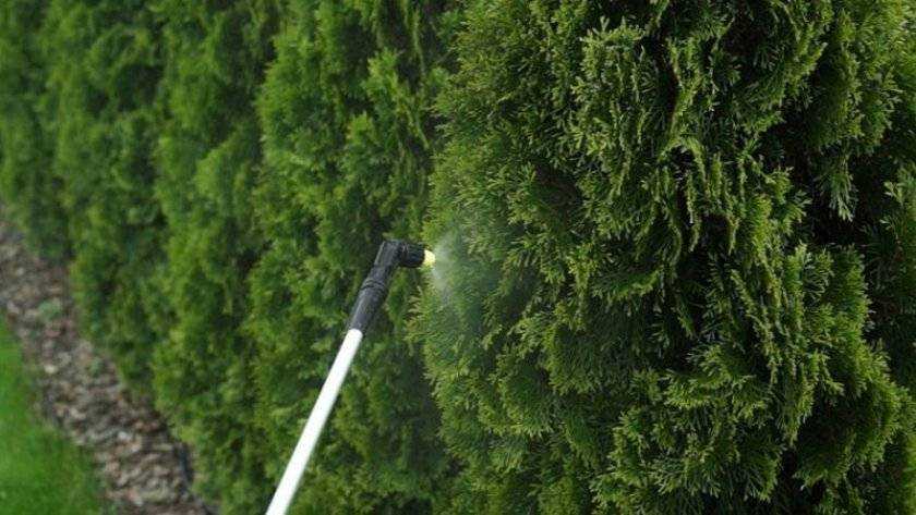Иногда читатели обращаются к нам с вопросом, почему желтеет туя. Дело в том, что из насекомых-вредителей растение донимают ложнощитовки и тли, отчего туя желтеет и ее хвоя опадает. Чтобы избавиться от паразитов, растение до распускания почек обрабатывают Карбофосом, Рогором или Децисом, а в конце июня дважды опрыскивают Актелликом или Хлорофосом с интервалом в две недели.