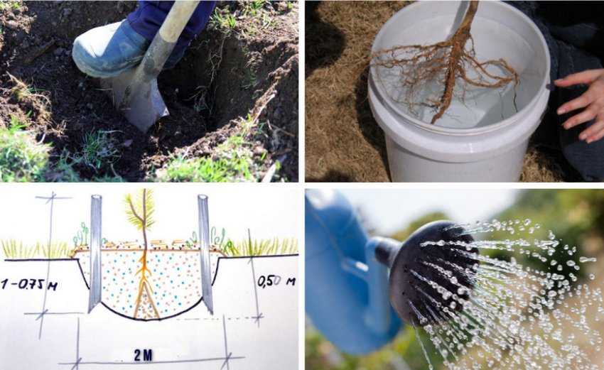 - Выкопать метровое углубление в грунте, ширина — 2 м (размеры ямы напрямую зависят от размера корневой системы дерева).