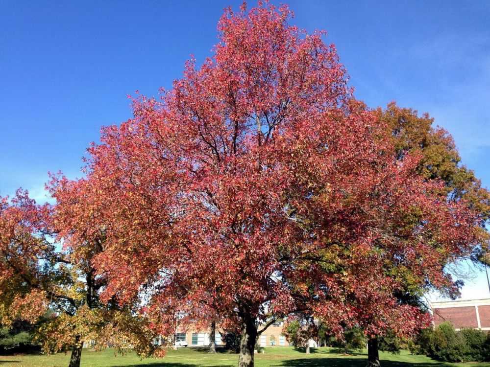 Красивое листопадное дерево с пирамидальной, симметричной формой кроны, с блестящими листьями, напоминающими листья клена, распускаются поздно, осенью окрашиваются в красный, фиолетовый и желтый цвет.