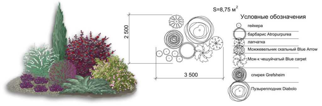Пурпурные листья пузыреплодника, барбариса и гейхеры оттеняются белыми гроздьями спиреи и россыпью цветков лапчатки. Голубая хвоя можжевельника придает композиции благородство и глубину. Состав композиции: