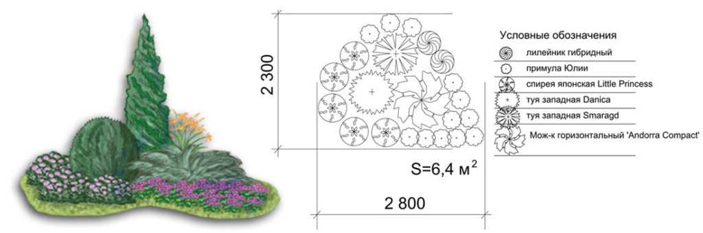 Основу композиции составляют декоративные хвойные растения. Весной цветение начнут примулы, летом его продолжит спирея и лилейники. Эта композиция будет красиво смотреться на фоне газонной травы, в нее входят: